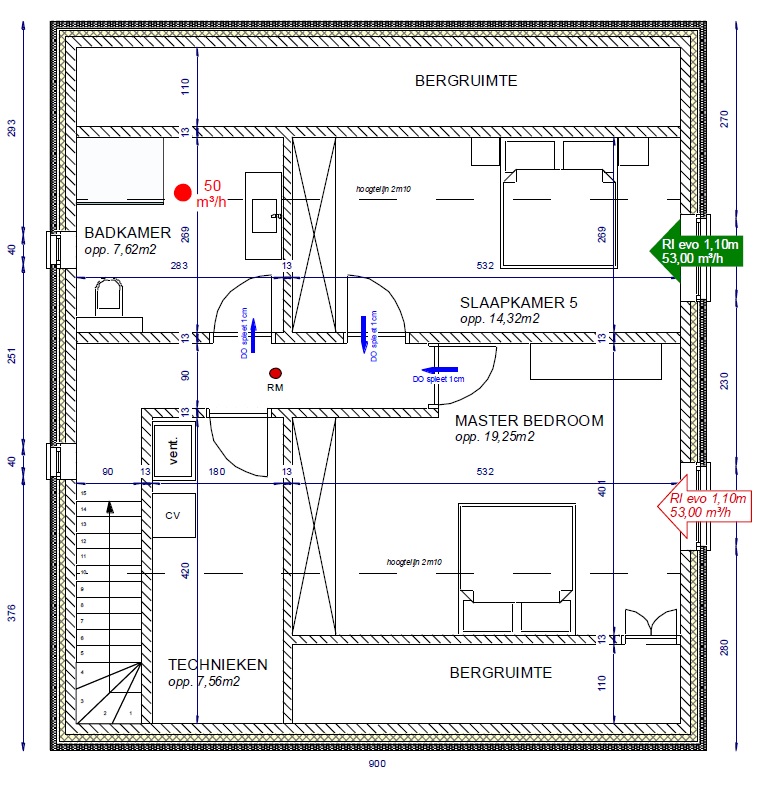 Maar liefst 6 slaapkamers: vier op de eerste verdieping (9,8 – 13 m²) en twee op de zolderverdieping, waaronder een master bedroom van 19 m² met aansluitende dressing.