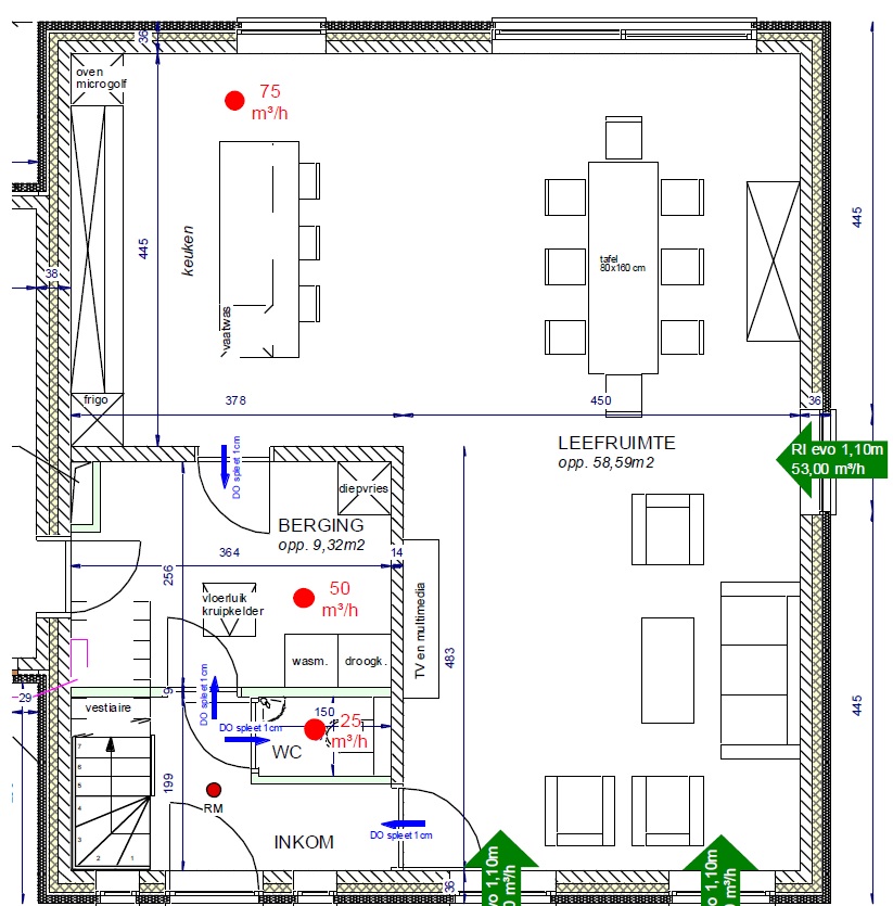 Gelijkvloers: inkomhal met gastentoilet | open keuken | eetkamer | leefruimte | berg-/wasplaats.